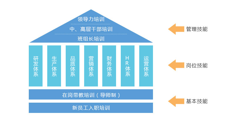 公司根据员工的职业生涯发展及岗位技能要求,有科学先进的培训体系,分别为:新员工入职培训、在岗带教培训(导师制)、岗位专业培训、班组长培训、中、高层干部培训、领导力培训等。并拥有现代化的培训室、公司内、外部资深培训师,能满足不同层级员工的技能需求。